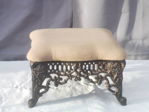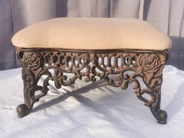 Structure en fonte, repose sur 4 pieds et assise ferme recouverte d'une toile/tissu beige