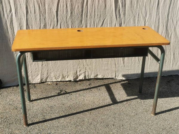 Bureau ancien d’écolier, plateau en bois en chêne doré massif, piètement tubulaire en métal