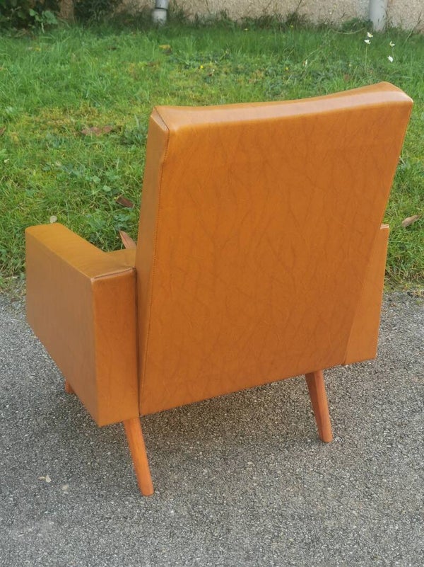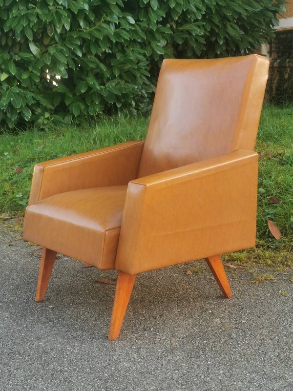 Structure en bois, recouvert d’un skaï marron, assise mousse et ressorts, pieds compas en bois