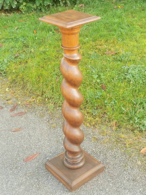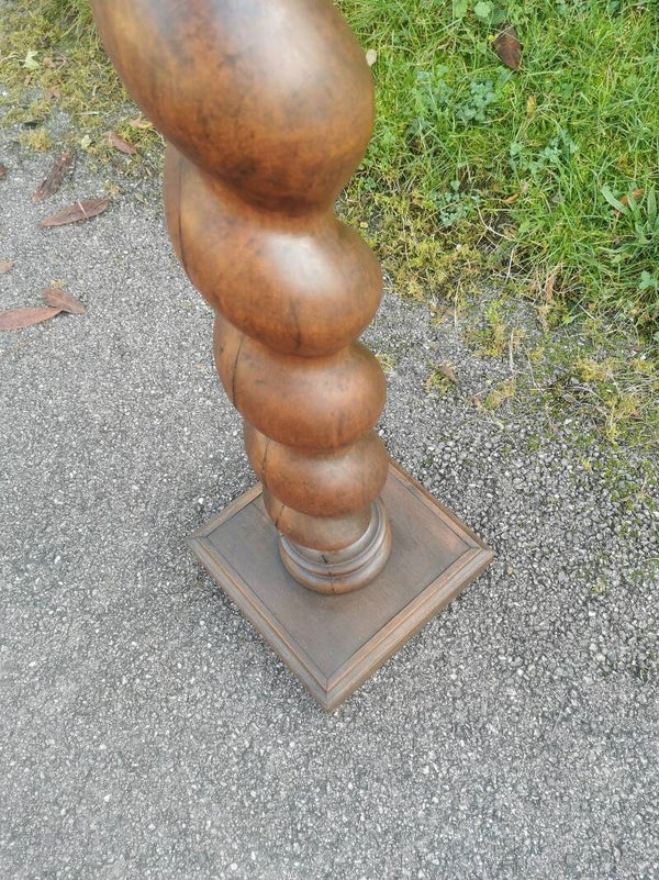 Grande colonne torsadée en bois, repose sur un socle en partie basse et dispose d’un plateau en partie haute