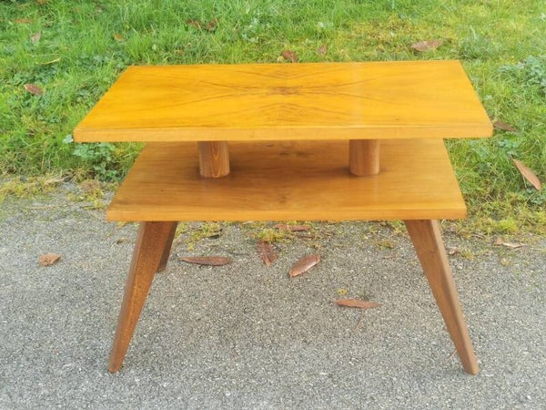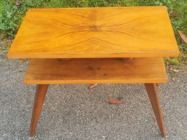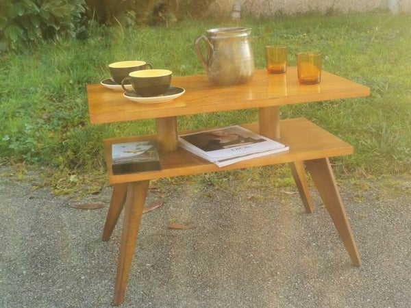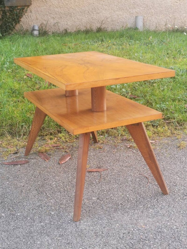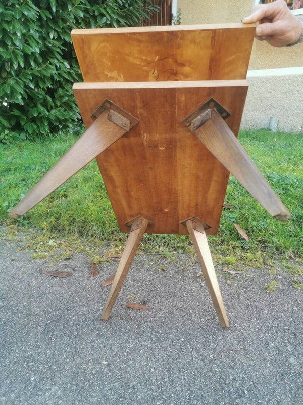 Originale table vintage, à 2 plateaux, reposant sur 4 grands pieds compas